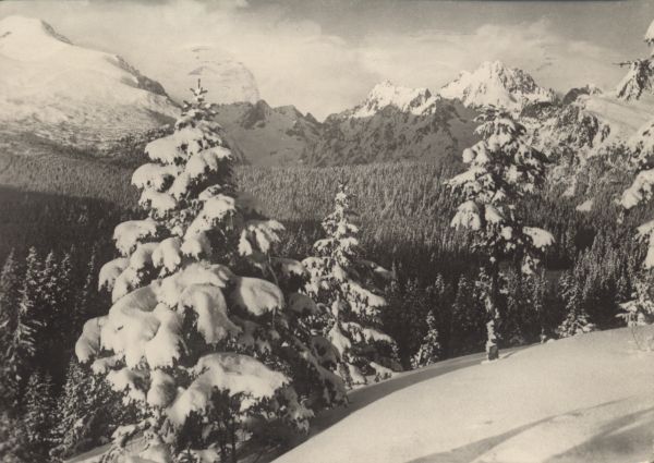 Zimowy widok na otoczenie Doliny Mięguszowieckiej. W tle od lewej Skrajna Baszta, Żabi Koń, Kopa Popradzka i Wysoka.