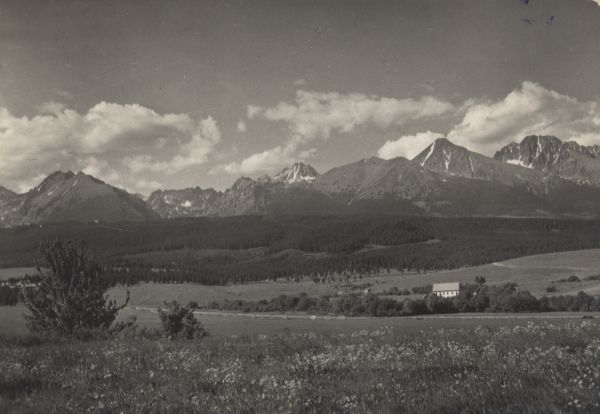 Panorama Tatr Wysokich widziana z miejscowo¶ci Szczyrba, widać od lewej: Skrajn± Basztę, Wołowy Grzbiet, Popradzk± Kopę, Rysy, Wysok±, Tęp±, Kończyst±, i Gerlach.