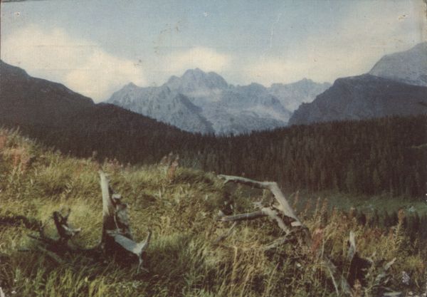 Tatrzański Park Narodowy [Słowacja]. Od lewej strony: Wysoka, Smoczy Szczyt, Ganek, Żłobisty Szczyt. Tytuł również w języku: ros., ang., niem.