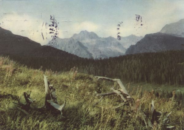 Tatrzański Park Narodowy [Słowacja]. Od lewej strony: Wysoka, Smoczy Szczyt, Ganek, Żłobisty Szczyt. Tytuł również w języku: ros., ang., niem.