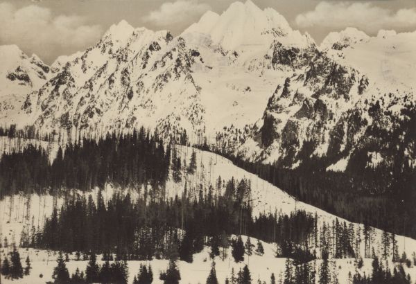 Widok na zaśnieżone szczyty: Kopę Popradzką, Rysy i Wysoką.