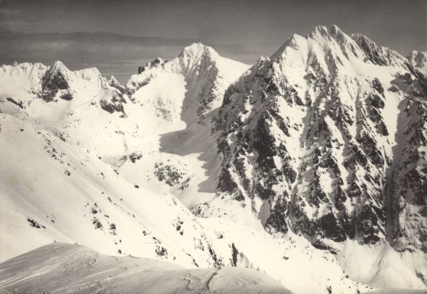 VYSOKÉ TATRY Volia veža (2373 m, zľava), Žabí Kôň (2300 m), Rysy (2499 m), Vysoká (2560 m) a Kôpky nad Mengusovskou dolinou. (2354 m)