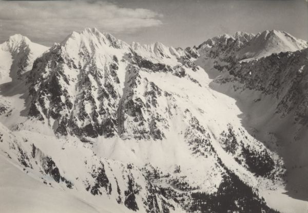 Widok ze Skrajnej Baszty na Dolinę Mięguszowiecką i Dolinę Złomisk w zimowej scenerii. Od lewej szczyty: Rysy, Wysoka i Kończysta. W tle Gerlach.