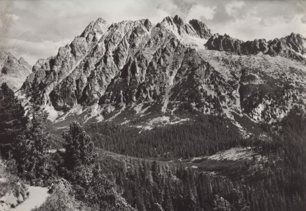 Widok z magistrali tatrzańskiej na Kopę Popradzką, Wysoką, Ganek i Rumanowy Szczyt oraz Dolinę Mięguszowiecką. Po lewej stronie limby (Pinus cembra L.), w głębi las.