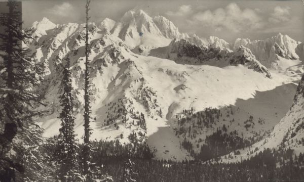 Widok na zimowy pejzaż Tatr Wysokich. Od lewej: Kopa Popradzka, Wysoka i Żłobisty Szczyt.