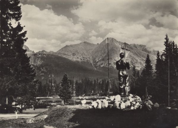 Na pierwszym planie pomnik. W głębi Nowe Szczyrbskie Jezioro. W tle widać Osterwę i Tępą.