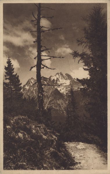 TATRY WYSOKIE. Droga ze Szczyrbskiego Jeziora do Popradzkiego Stawu. W tle Wysoka. Tytuł również w języku: fr.