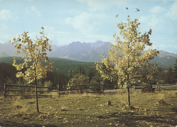 Panorama Tatr widoczna z Polany Głodówki. Na pierwszym planie dwa jawory (Acer pseudoplatanus L.). Fotografia barwna.