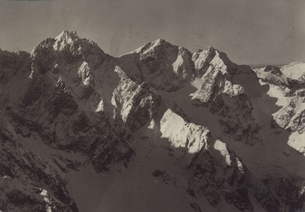 VYSOKÉ TATRY - pohľad z Prielomu (2288 m). Vľavo Rumanov štít (2428 m) a Ganek (2459 m). Za nimi Vysoká (2560 m), sedlo Váha (2337 m), Rysy (2499 m) a Nižné Rysy (2438 m).