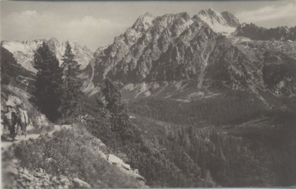 Widok na Wysoką ze szlaku. Po lewej stronie w rogu dwoje turystów. W tle po lewej widać Żabi Koń i Żabią Turnię Mięguszowiecką.