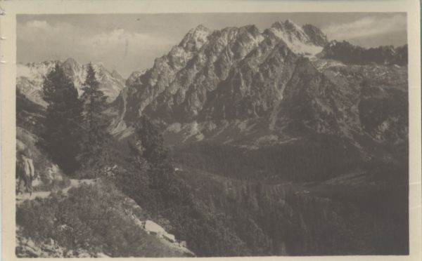 Widok na Wysoką ze szlaku. Po lewej stronie w rogu dwoje turystów. W tle po lewej widać Żabi Koń i Żabią Turnię Mięguszowiecką.
