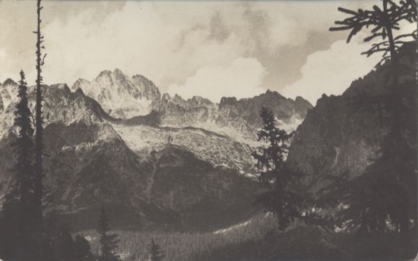 Widok na Tatry Wysokie. W tle Wysoka obok po prawej Rumanowy Szczyt, Ganek, Żłobisty Szczyt oraz Dolina Złomisk.