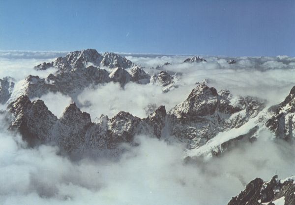 Zimowy widok z Łomnicy na zachód. Z chmur wyłaniają się: Gerlach i Wysoka w tle, w przodzie Pośrednia Grań i Mały Lodowy Szczyt.