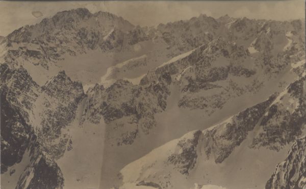 Vysoké Tatry - Pohľad s vrcholu Lomnického štítu 2636 m. Stalinov štít 2663 m. Vysoká 2565 m. Kriváň 2496 m. Veľká studená dolina, Prostredný hrebeň, Malá studená dolina.