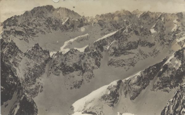 Vysoké Tatry - Pohľad s vrcholu Lomnického štítu 2636 m. Stalinov štít 2663 m. Vysoká 2565 m. Kriváň 2496 m. Veľká studená dolina, Prostredný hrebeň, Malá studená dolina.
