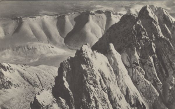 Zimowy widok z Łomnicy na wschód. Z prawej Kieżmarski Szczyt, w tle grań Tatr Bielskich.
