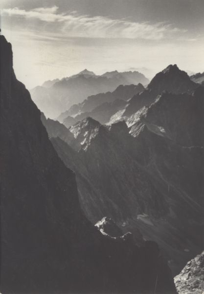 VYSOKÉ TATRY - Hohe Tatra - The High Tatras. Pohľad z hrebeňa Zadného Gerlachu ponad Kačaciu dolinu. Na horizonte Kriváň (2494 m) vpravo Vysoká (2560 m).