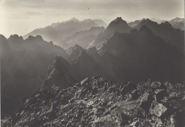 VYSOKÉ TATRY - Hohe Tatra - The High Tatras. Pohµad z Gerlachovského ątítu ponad Batizovský ątít (2448 m), vµavo hrebeň Končistej, na obzore Kriváň (2494 m), vpravo Vysoká (2560 m) a Rysy (2499 m).