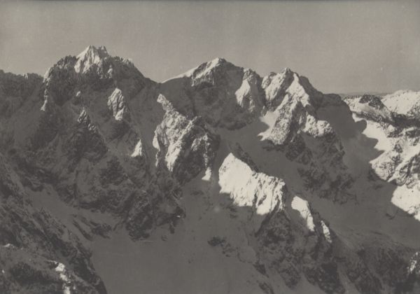 VYSOKÉ TATRY. Pohľad z Prielomu (2288 m). Vľavo Rumanov štít (2428 m) a Ganek (2459 m). Za nimi Vysoká (2580 m), sedlo Váha (2337 m), Rysy (2499 m) a Nižné Rysy (2438 m).