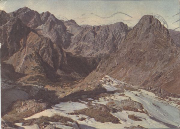 Tatrzański Park Narodowy [Słowacja] - od lewej: Rysy, Niżnie Rysy, Wyżni Żabi Szczyt, Młynarz i Hruba Turnia. Tytuł również w j. ros., ang., niem.