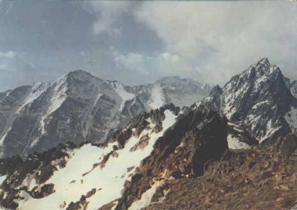 TATRANSKÝ NÁRODNÝ PARK - Pohľad z Lomnického sedla (2193 m) na juhozápad. Vľavo Slavkovský štít (2453 m), uprostred Gerlachovský štít (2655 m), vpravo Prostredný hrot (2440 m).