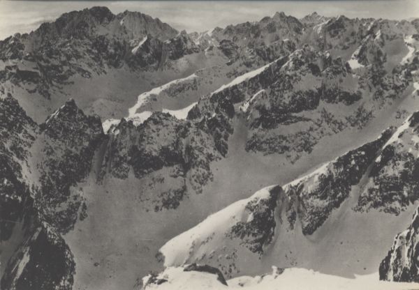 VYSOKÉ TATRY - pohľad z vrcholu Lomnického štítu (2634 m): Stalinov štít (2663 m), Vysoká (2565 m), Kriváň (2496 m), Veľká Studená dolina, Prostredný hrebeň (2440 m), Malá Studená dolina.