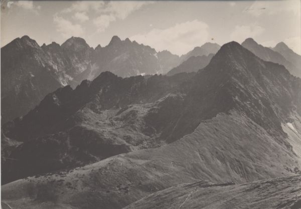 TATRANSKÝ NÁRODNÝ PARK. Pohµad na Lomnickú skupinu z Belanských Tatier. Zµava: Keľmarský (2550 m) a Lomnický ątít (2634 m), Baranie rohy (2536 m). V popredí: Jahňací (2231 m), vµavo: Kozí (2116 m), Kolový (2425 m) a Ąadový ątít (2630 m).