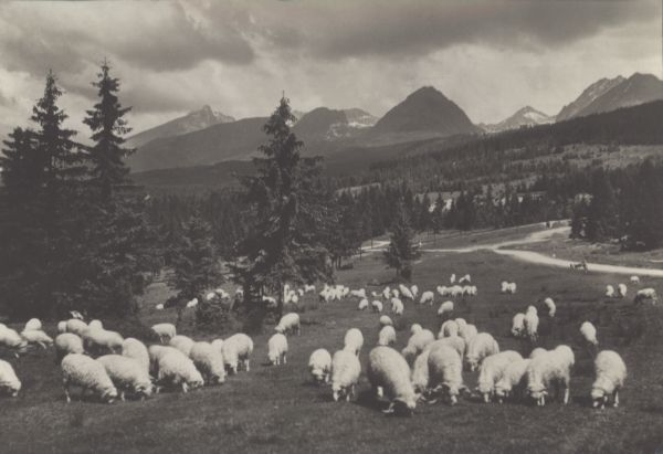 Widok na owce pas±ce się na ł±ce w Szczyrbie. W tle Krywań, Siodełkowa Kopa, Wielkie Solisko, Szczyrbski Szczyt i Skrajna Baszta.
