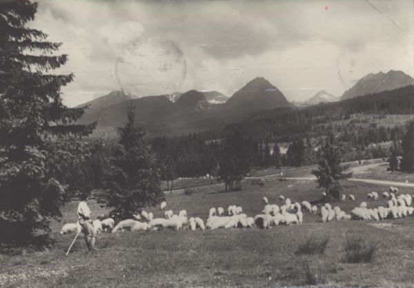 Owce pasące się na łące w Szczyrbie. W tle Krywań, Krótka, Ostra, Wielkie Solisko, Szczyrbski Szczyt i Skrajna Baszta.