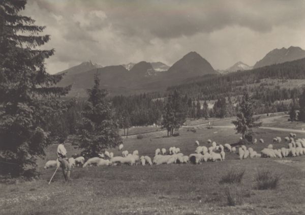 Owce pas±ce siź na ³±ce w Szczyrbie. W tle Krywań, Krótka, Ostra, Wielkie Solisko, Szczyrbski Szczyt i Skrajna Baszta.