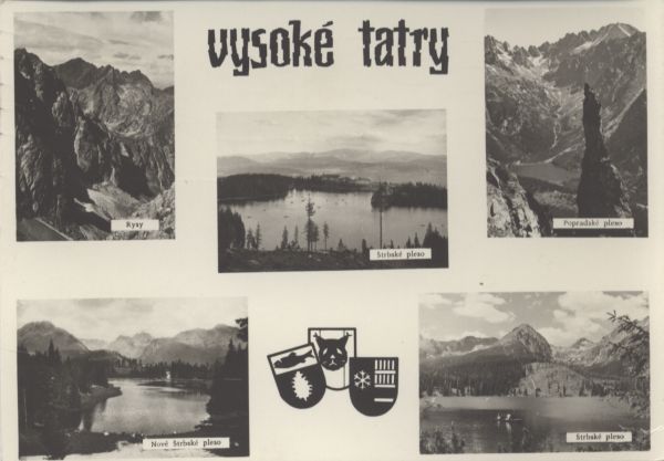 Pocztówka 5. elementowa ukazuj±ca atrakcje turystyczne miasta Wysokie Tatry. Na kolejnych zdjęciach zamieszczono: 1. Rysy, 2. Szczyrbskie Jezioro, 3. Popradzki Staw. 4. Nowe Szczyrbskie Jezioro, 5. Szczyrbskie Jezioro. W górnej czę¶ci pocztówki napis: vysoké tatry, w dolnej 3 herby.