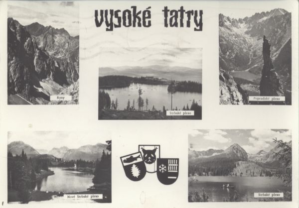 Pocztówka 5. elementowa ukazuj±ca atrakcje turystyczne miasta Wysokie Tatry. Na kolejnych zdjęciach zamieszczono: 1. Rysy, 2. Szczyrbskie Jezioro, 3. Popradzki Staw. 4. Nowe Szczyrbskie Jezioro, 5. Szczyrbskie Jezioro. W górnej czę¶ci pocztówki napis: vysoké tatry, w dolnej 3 herby.