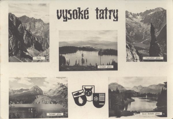 Pocztówka 5. elementowa ukazuj±ca atrakcje turystyczne miasta Wysokie Tatry. Na kolejnych zdjęciach zamieszczono: 1. Rysy, 2. Szczyrbskie Jezioro, 3. Popradzki Staw. 4. Nowe Szczyrbskie Jezioro, 5. Szczyrbskie Jezioro. W górnej czę¶ci pocztówki napis: vysoké tatry, w dolnej 3 herby.