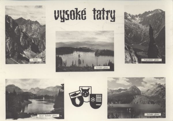 Pocztówka 5. elementowa ukazuj±ca atrakcje turystyczne miasta Wysokie Tatry. Na kolejnych zdjęciach zamieszczono: 1. Rysy, 2. Szczyrbskie Jezioro, 3. Popradzki Staw. 4. Nowe Szczyrbskie Jezioro, 5. Szczyrbskie Jezioro. W górnej czę¶ci pocztówki napis: vysoké tatry, w dolnej 3 herby.