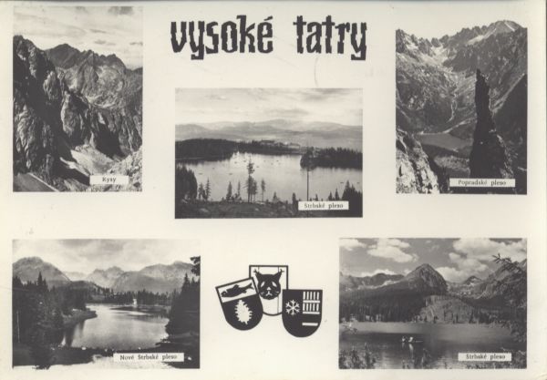 Pocztówka 5. elementowa ukazuj±ca atrakcje turystyczne miasta Wysokie Tatry. Na kolejnych zdjęciach zamieszczono: 1. Rysy, 2. Szczyrbskie Jezioro, 3. Popradzki Staw. 4. Nowe Szczyrbskie Jezioro, 5. Szczyrbskie Jezioro. W górnej czę¶ci pocztówki napis: vysoké tatry, w dolnej 3 herby.