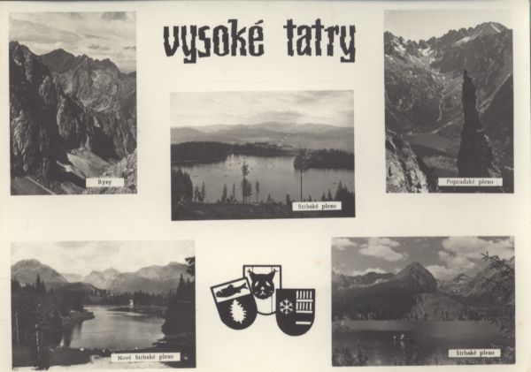 Pocztówka 5. elementowa ukazuj±ca atrakcje turystyczne miasta Wysokie Tatry. Na kolejnych zdjęciach zamieszczono: 1. Rysy, 2. Szczyrbskie Jezioro, 3. Popradzki Staw. 4. Nowe Szczyrbskie Jezioro, 5. Szczyrbskie Jezioro. W górnej czę¶ci pocztówki napis: vysoké tatry, w dolnej 3 herby.