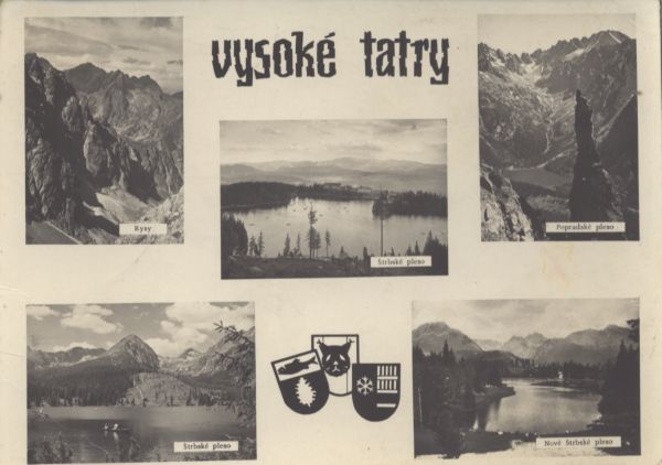 Pocztówka 5. elementowa ukazuj±ca atrakcje turystyczne miasta Wysokie Tatry. Na kolejnych zdjęciach zamieszczono: 1. Rysy, 2. Szczyrbskie Jezioro, 3. Popradzki Staw. 4. Nowe Szczyrbskie Jezioro, 5. Szczyrbskie Jezioro. W górnej czę¶ci pocztówki napis: vysoké tatry, w dolnej 3 herby.