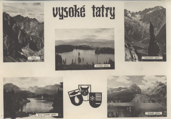 Pocztówka 5. elementowa ukazuj±ca atrakcje turystyczne miasta Wysokie Tatry. Na kolejnych zdjęciach zamieszczono: 1. Rysy, 2. Szczyrbskie Jezioro, 3. Popradzki Staw. 4. Nowe Szczyrbskie Jezioro, 5. Szczyrbskie Jezioro. W górnej czę¶ci pocztówki napis: vysoké tatry, w dolnej 3 herby.