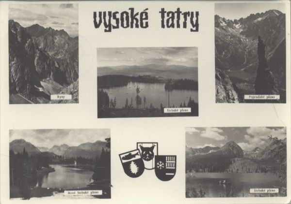 Pocztówka 5. elementowa ukazuj±ca atrakcje turystyczne miasta Wysokie Tatry. Na kolejnych zdjęciach zamieszczono: 1. Rysy, 2. Szczyrbskie Jezioro, 3. Popradzki Staw. 4. Nowe Szczyrbskie Jezioro, 5. Szczyrbskie Jezioro. W górnej czę¶ci pocztówki napis: vysoké tatry, w dolnej 3 herby.