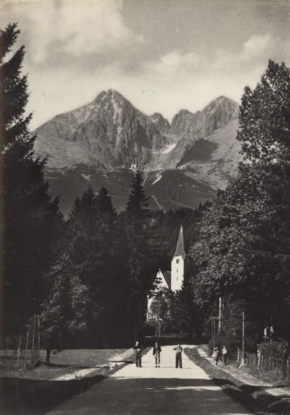 Tatrzańska Łomnica. Widok na kościół ewangelicki. Na pierwszym planie ulica, po której idzie kilka osób. W tle Łomnica i Kieżmarski Szczyt.