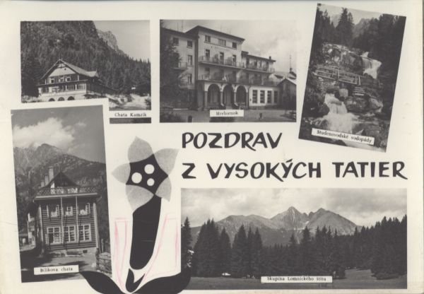 POZDRAV Z VYSOKÝCH TATIER. Chata Kamzík, Hrebienok, Studenovodské vodopády, Skupina Lomnického štítu, Bilíkova chata.