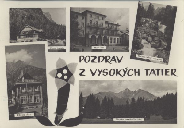 Widok na grupę Łomnicy. Pod zdjęciami opisy. Po środku napis: Pozdrav z Vysokých Tatier i rysunek goryczki.