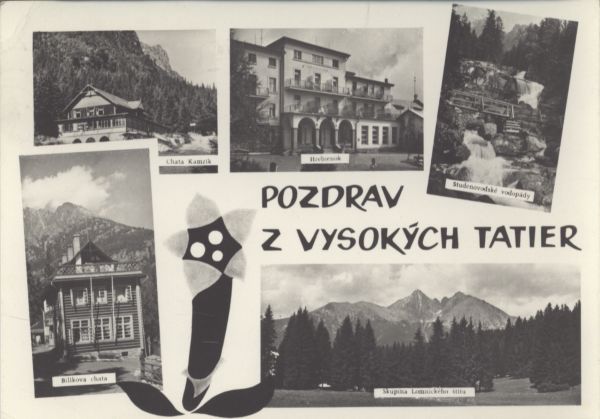 POZDRAV Z VYSOKÝCH TATIER. Chata Kamzík, Hrebienok, Studenovodské vodopády, Skupina Lomnického štítu, Bilíkova chata.