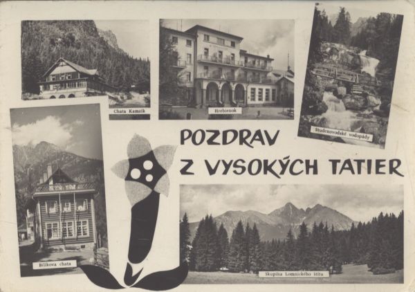 POZDRAV Z VYSOKÝCH TATIER. Chata Kamzík, Hrebienok, Studenovodské vodopády, Skupina Lomnického štítu, Bilíkova chata.