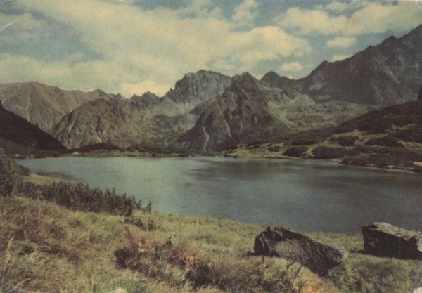Tatrzański Park Narodowy [Słowacja] - widok od Ciężkiego Stawu. Z lewej: Żabi Wierch Jaworowy, ¦wistowy Szczyt, Mała Wysoka, Wielicki Szczyt i zbocza Zadniego Gerlacha. Tytuł również w języku: ros., ang., niem.