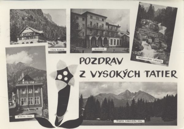 POZDRAV Z VYSOKÝCH TATIER. Chata Kamzík, Hrebienok, Studenovodské vodopády, Skupina Lomnického štítu, Bilíkova chata.