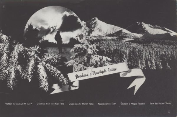 Na pocztówce znajduje się sylwetka narciarza na tle wielkiego okrągłego księżyca i tatrzańskich szczytów. Z lewej stronie na pierwszym planie ośnieżona gałązka świerka, pośrodku wstęga z napisem: Pozdrav z Vysokých Tatier. Na dole tytuł w języku rosyjskim, angielskim, niemieckim, polskim, węgierskim i francuskim.