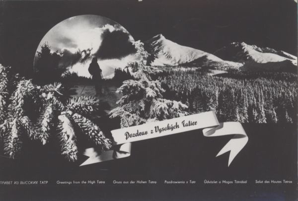 Na pocztówce znajduje się sylwetka narciarza na tle wielkiego okrągłego księżyca i tatrzańskich szczytów. Z lewej stronie na pierwszym planie ośnieżona gałązka świerka, po środku wstęga z napisem: Pozdrav z Vysokých Tatier. Na dole tytuł w języku rosyjskim, angielskim, niemieckim, polskim, węgierskim i francuskim.