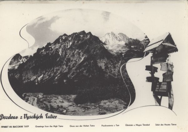 Na pocztówce znajduje się nieregularny kształt z pejzażem Tatr Wysokich w środku, obok kierunkowskaz turystyczny. Napis: Pozdrav z Vysokých Tatier. Na dole tytuł w jezyku Rosyjskim, angielskim, niemieckim, polskim, węgierskim i francuskim.