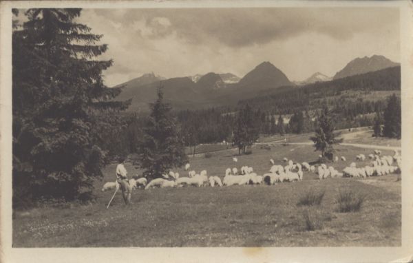 Owce pasące się na łące w Szczyrbie. W tle Krywań, Krótka, Ostra, Wielkie Solisko, Szczyrbski Szczyt i Skrajna Baszta.